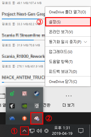 원드라이브가 실행중이라면 우측 하단 백그라운드앱에서 아래와 같이 흰구름 모양 아이콘 우클릭 → '설정' 을 클릭합니다. 이 와중에도 저렇게 열심히 무언가를 업로드 하고 있네요. 불-편