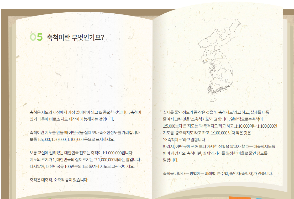 축척(縮尺)은 실제의 거리를 지도 상에 축소하여 표시하였을 때의 축소 비율을 의미한다.