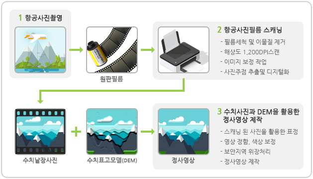 - 지표면의 비고(比高)에 의하여 발생하는 사진 상의 각 점의 왜곡을 보정하여 동일 축척이 되도록 지도처럼 만든 영상을 말한다.