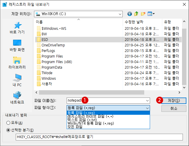 ▼ .reg 파일로써 적절한 1 파일명을 지정한 후, 2저장 버튼을 클릭합니다.