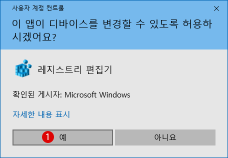 ▼ 레지스트리 편집기의 시작을 허용할지 여부를 확인하는 사용자 계정 컨트롤(UAC)화면이 표시됩니다. 1예 버튼을 클릭합니다.