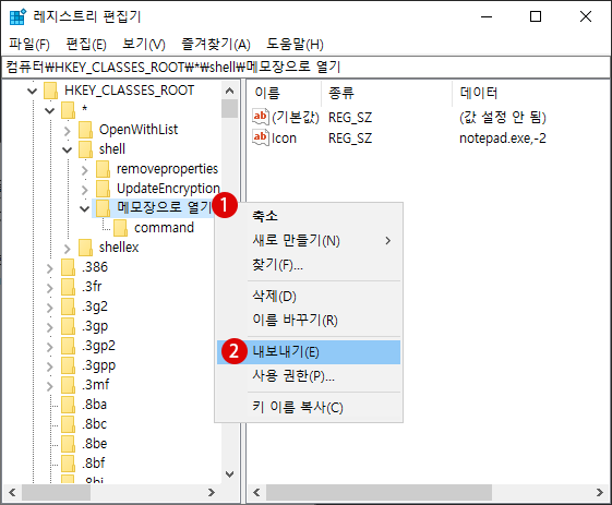 ▼ 아래와 같이 메모장으로 열기 레지스트리 키를 만들었으면 레지스트리 스크립트 (.reg) 파일을 만듭니다. 1해당 키(key)를 마우스 오른쪽 클릭하고, 2내보내기를 클릭합니다.