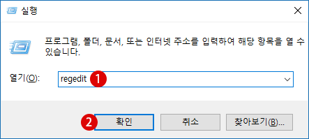 ▼ 먼저 아래와 같이 Windows + R 키를 눌러, 실행을 엽니다. 텍스트 상자에 1regedit를 입력한 다음, 2OK 버튼을 클릭합니다.