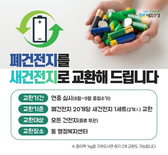 요즘은 주민센터에서 따로 모아 새 건전지로 바꿔주는 곳도 있습니다.